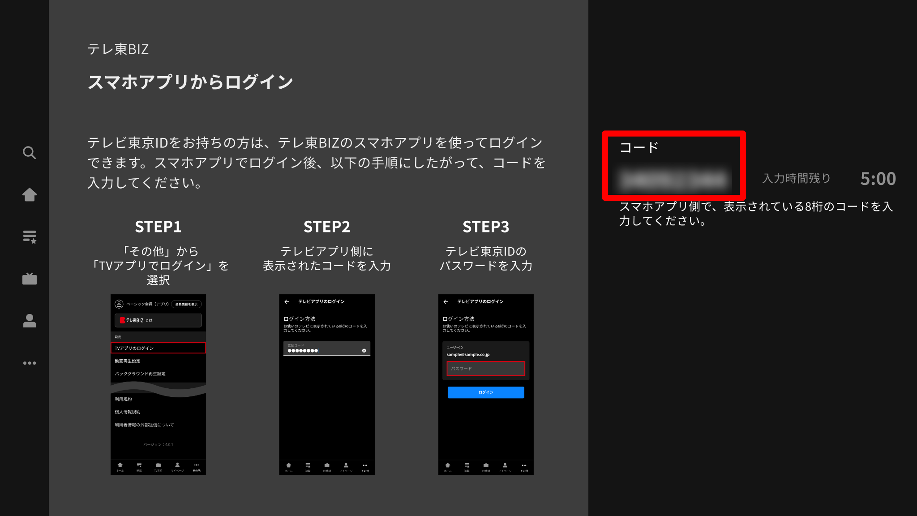 テレビ東京IDをお持ちの方は、STBデバイス(FireTV、AndroidTV、AppleTV)にテレ東BIZのスマホアプリを使ってログインできます。