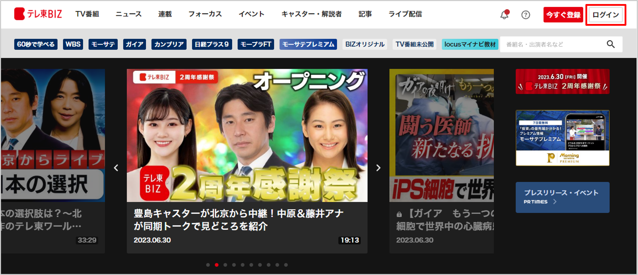 1.テレ東BIZ Webサイトの「ログイン」をクリック。