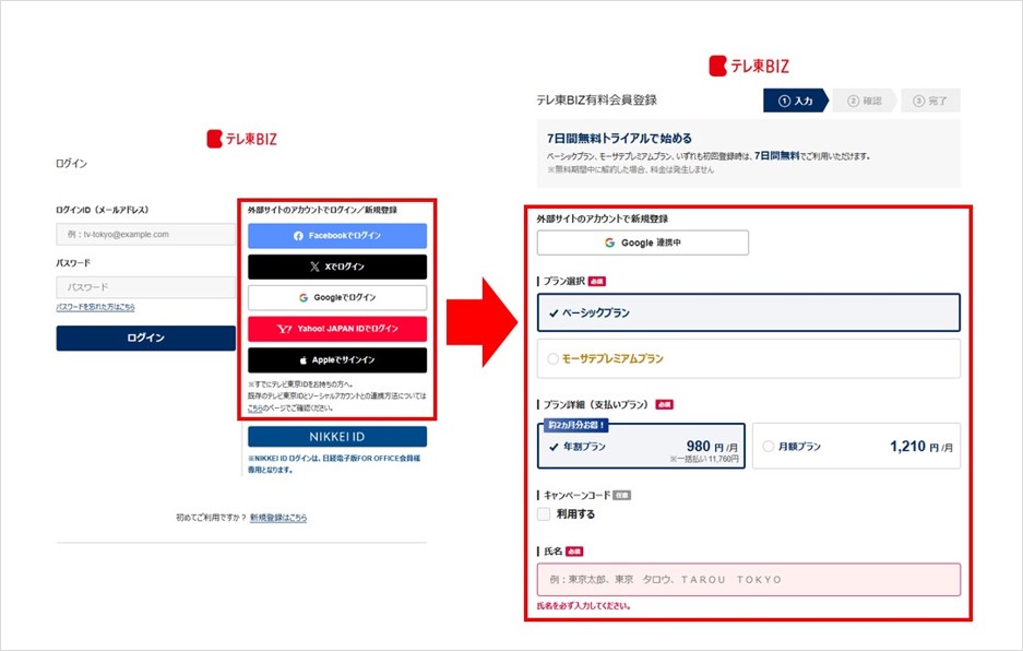 2.「外部サイトのアカウントログイン/新規登録」よりアカウントを選択し、会員情報を入力し「同意して確認画面に進む」をクリックし完了。