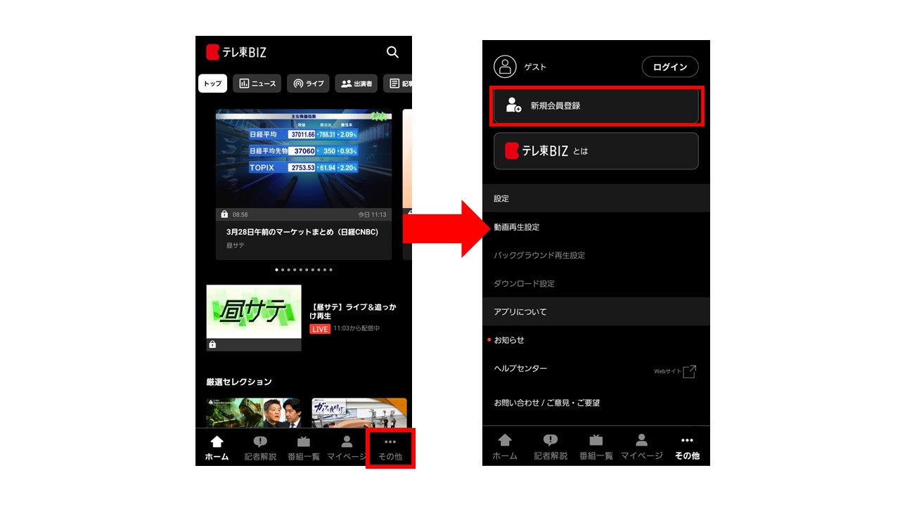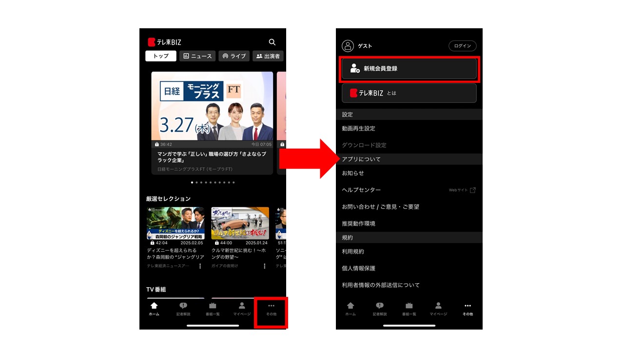 1.アプリをインストール後、「その他」から「新規会員登録」をタップ。