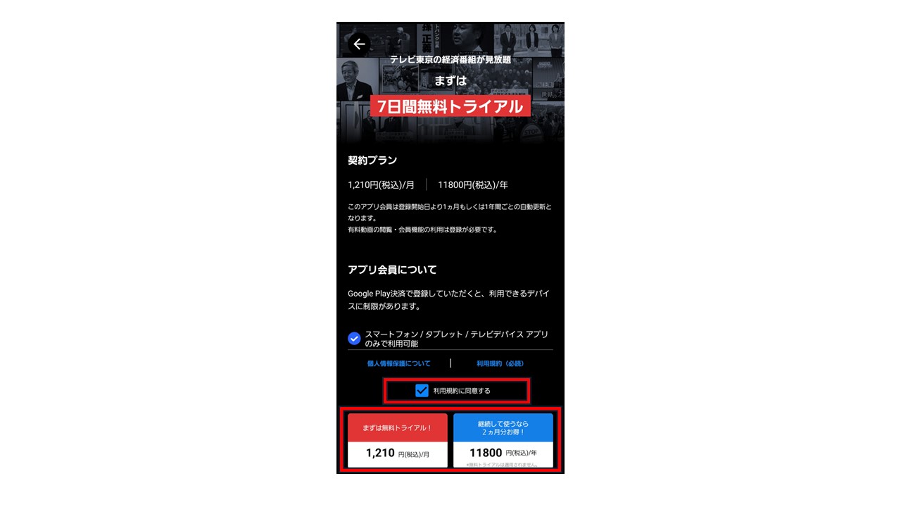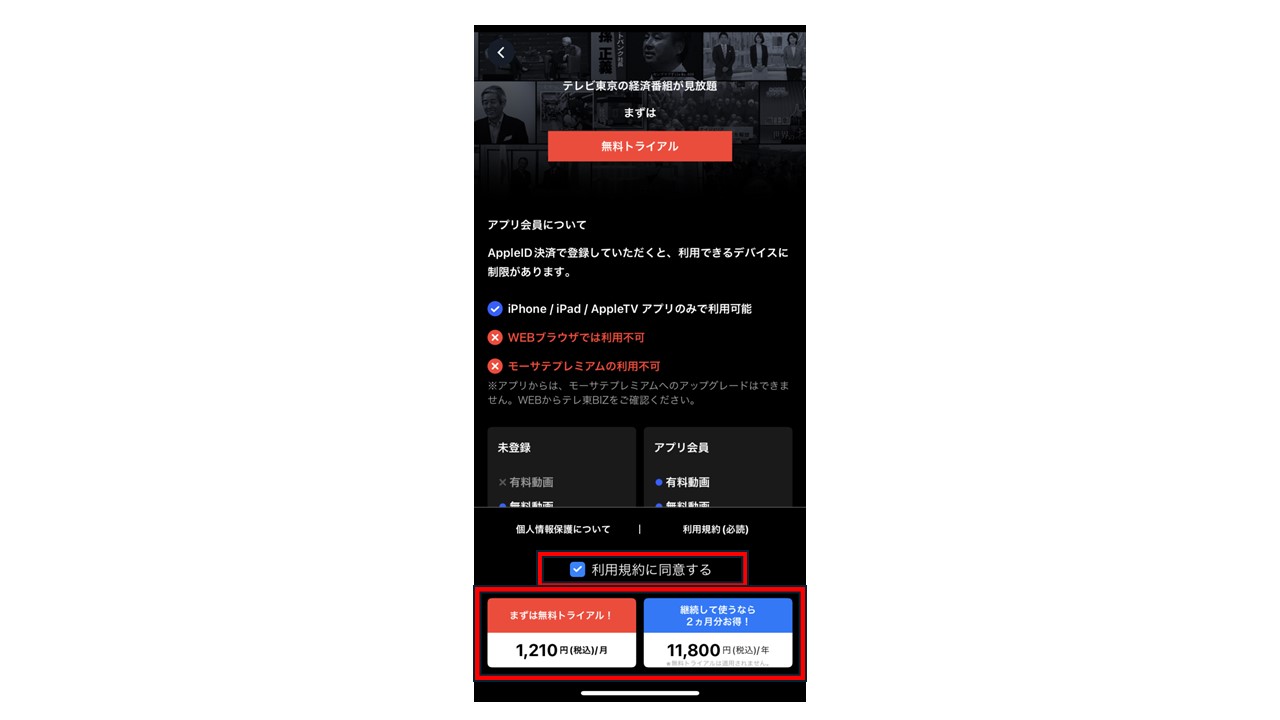 テレ東BIZアプリをインストール後、月額プラン【月額1,210円(税込)】か、1年毎に自動更新の年割プラン【年額11,800円(税込)】を選択しご利用ください。