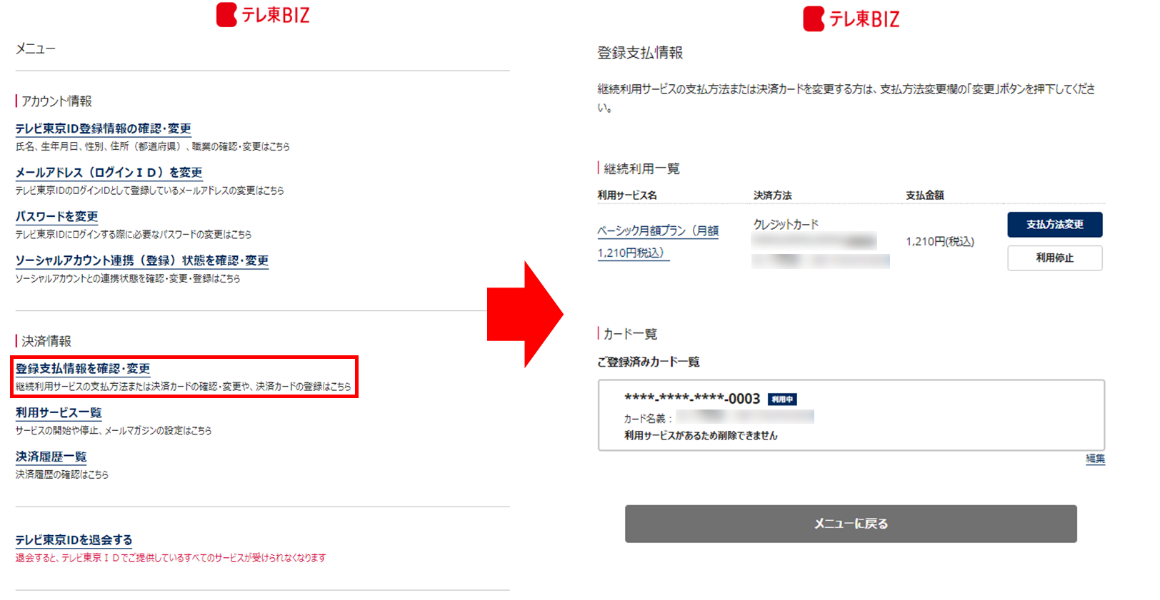 登録したクレジットカードを変更したい。 ログイン後、「アカウント設定」の「登録支払情報を確認・変更」から設定してください。※アプリでは設定できません。Webサイトでログインしてお手続きください。 ■変更手順1.ログイン後、パソコン・スマートフォン上の画面右上の「人物アイコン」の「アカウント設定」を選択。 2.「登録支払情報を確認・変更」の「支払方法変更」から設定。 ※クリックすると画像が拡大されます。 関連記事 テレ東BIZ(Web会員)の利用をやめたい テレ東BIZの会員の種類と料金を教えてください。 アプリ課金から別の支払い方法に変更したい。 支払い方法を教えてください。 解約したのに、課金が行われています。