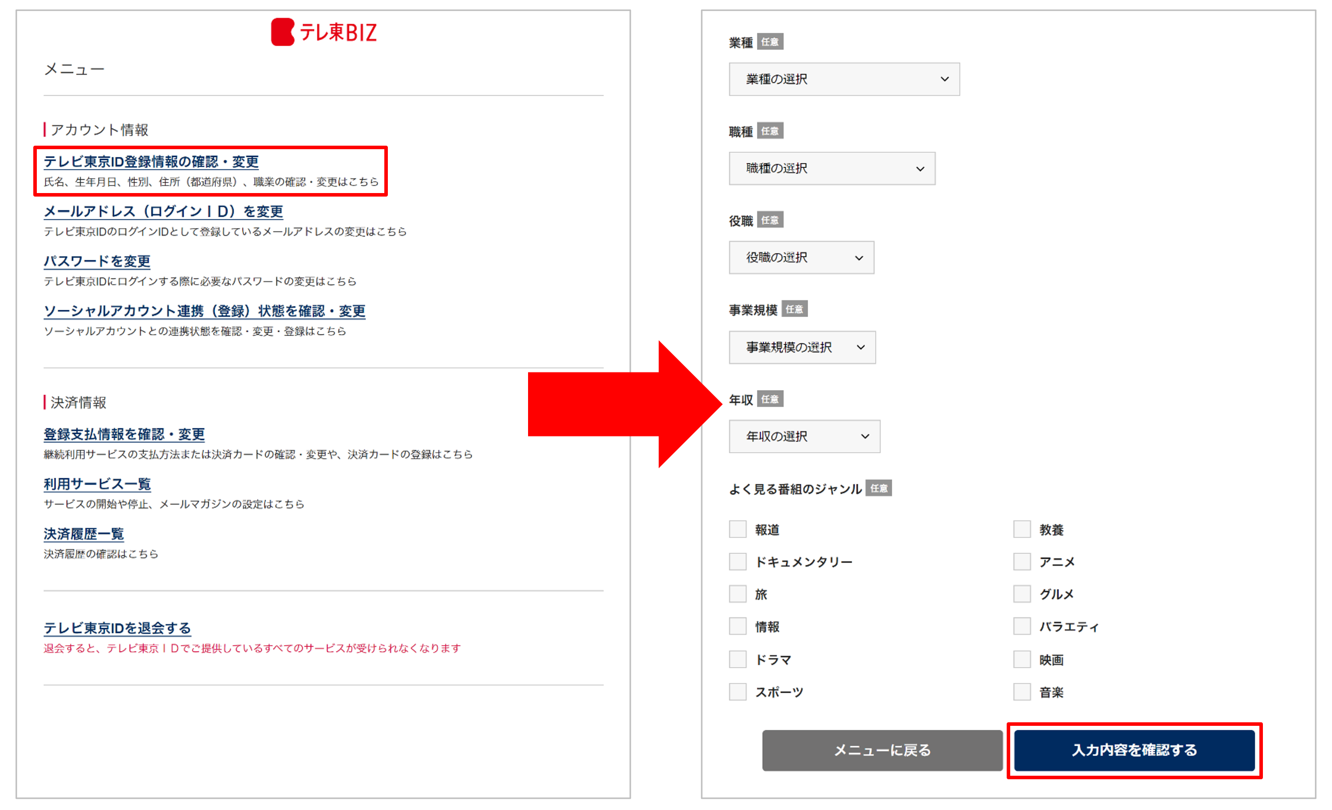 契約情報を確認、変更したい。 ログイン後、パソコン・スマートフォン上の画面右上の「人物アイコン」の「アカウント設定」から確認できます。※アプリには「契約情報」はございません。Webサイトでログインして確認してください。 ■変更手順1.ログイン後、パソコン・スマートフォン上の画面右上の「人物アイコン」の「アカウント設定」を選択。 2.「テレビ東京ID登録情報の確認・変更」から情報を入力し「入力内容を確認する」をクリックして更新。 ※クリックすると画像が拡大されます。 関連記事 テレ東BIZ(Web会員)の利用をやめたい テレ東BIZの会員の種類と料金を教えてください。 無料期間中に解約することはできますか? 利用再開の方法を教えてください。 ログインID(メールアドレス)を忘れました。