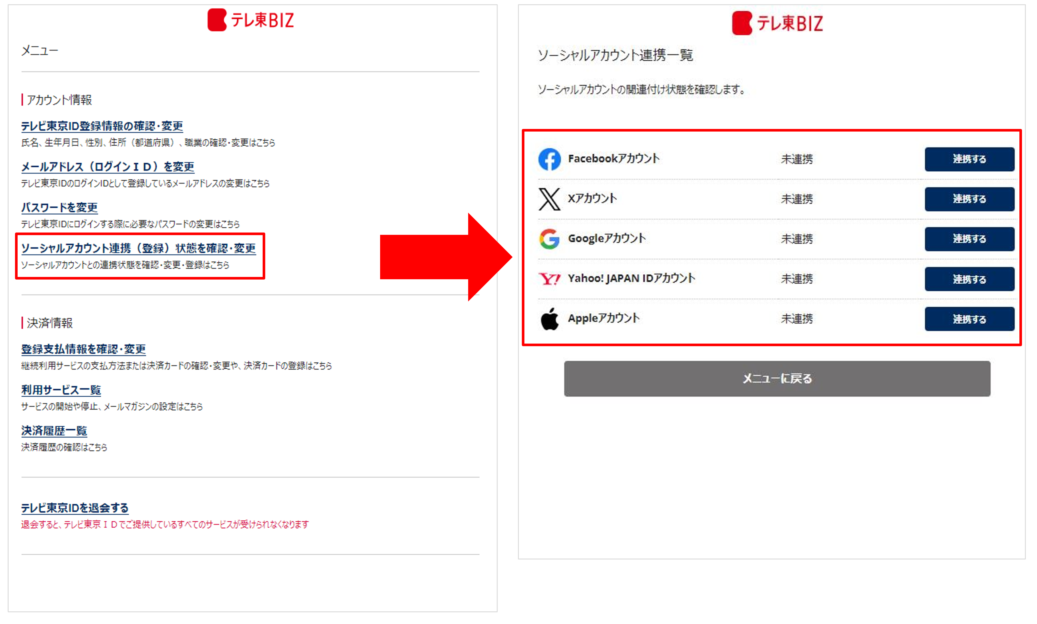 IDと外部サイトのアカウントを連携、 解除するには? ログイン後、「アカウント設定」の「ソーシャルアカウント連携(登録)状態を確認・変更する」から設定してください。※アプリでは設定できません。Webサイトでログインしてお手続きください。 ■手順1.ログイン後、パソコン・スマートフォン上の画面右上の「人物アイコン」の「アカウント設定」を選択。 2.「ソーシャルアカウント連携(登録)状態を確認・変更する」から関連付け・解除を設定。 ※クリックすると画像が拡大されます。 関連記事 テレ東BIZ(Web会員)の利用をやめたい ログインID(メールアドレス)を忘れました。 端末変更やアプリの再インストールなどで定期購入が解除された場合、どうすれば定期購入状態へ復元できますか? パスワードを忘れました。パスワードを再設定したい。 「ログインID(メールアドレス)またはパスワードが間違っています。」と表示されます。