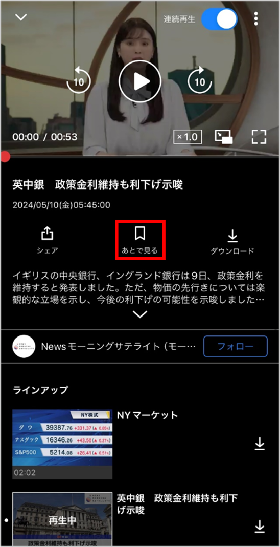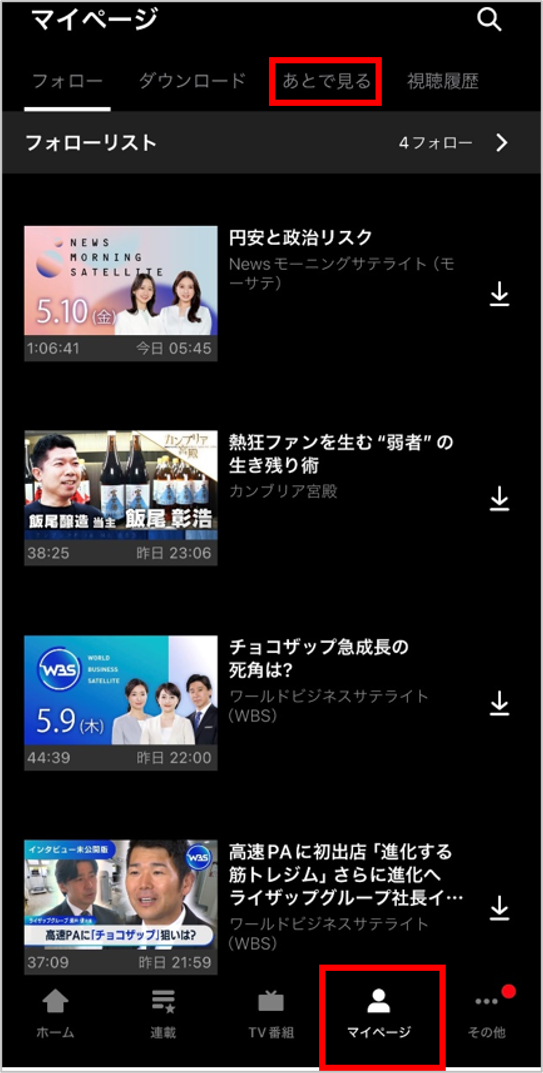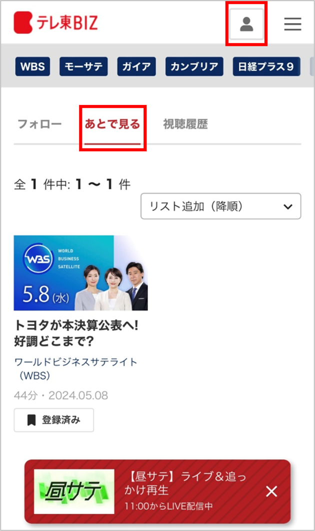 あとで見るとは何ですか? お気に入りのコンテンツや後で視聴したいコンテンツを保存できる機能です。 ■Webサイトでのご利用方法ログイン後、サムネイル画像下の「あとで見る」をクリックしてください。 保存したコンテンツは、パソコン画面右上の「人型アイコン」の「あとで見る」からご確認いただけます。 ■アプリでのご利用方法ログイン後、動画再生画面下の「あとで見る」をタップして「登録済み」にしてください。 保存したコンテンツは、マイページの「あとで見る」からご確認いただけます。 なお、「登録済み」をクリックすると登録解除されます。 ※クリックすると画像が拡大されます。 関連記事 ミニプレイヤー機能とは何ですか? フォローとは何ですか? ベーシックプランからモーサテプレミアムに変更する方法を教えてください。 番組をダウンロードできますか? 追っかけ再生とは何ですか?
