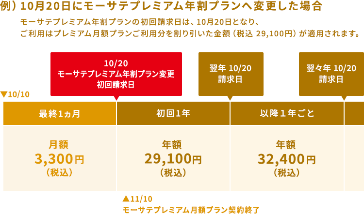 - モーサテプレミアム月額プランからモーサテプレミアム年割プランへの変更の場合、初回請求金額は年額料金から月額料金を引いた29,100円(税込)になります。