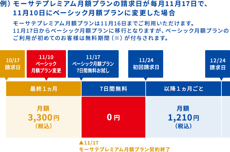 ■ モーサテプレミアム月額プランからベーシック月額プランへ変更した場合の課金スケジュール