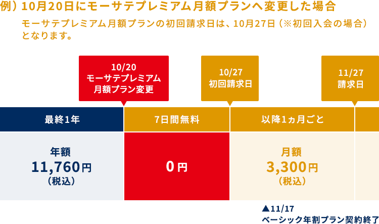 ■ ベーシック年割プラン(Web会員)からモーサテプレミアム月額プランへ変更した場合の課金スケジュール