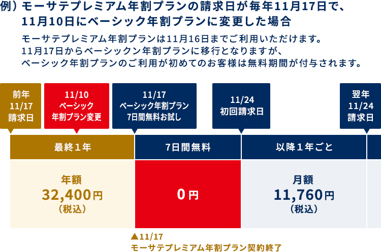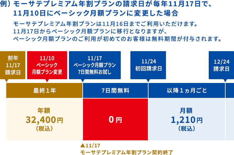 ■ モーサテプレミアム年割プランからベーシック年割プランへ変更した場合の課金スケジュール